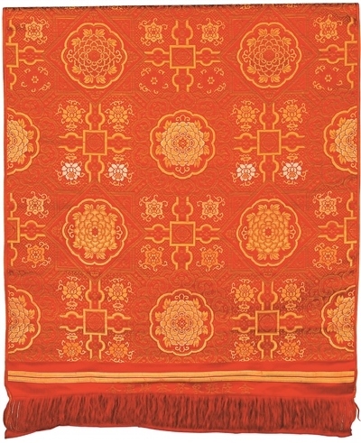 宋錦主產(chǎn)地為蘇州,與云錦、蜀錦并稱為中國古代三大名錦。宋錦采用經(jīng)線緯線聯(lián)合顯花的組織結(jié)構(gòu)和彩拋換色工藝,風(fēng)格古樸典雅,在古代多用于書畫裝裱,有著獨特的藝術(shù)魅力。清代紅地如意牡丹紋天華錦為宮廷用宋式錦,紅緞地上以彩色絲線和金線作緯顯花,圖案基本骨架為典型的宋錦紋樣——“米”字狀八達(dá)暈式樣,飾有牡丹、蓮花、如意紋等,寓意富貴安康、吉祥如意。