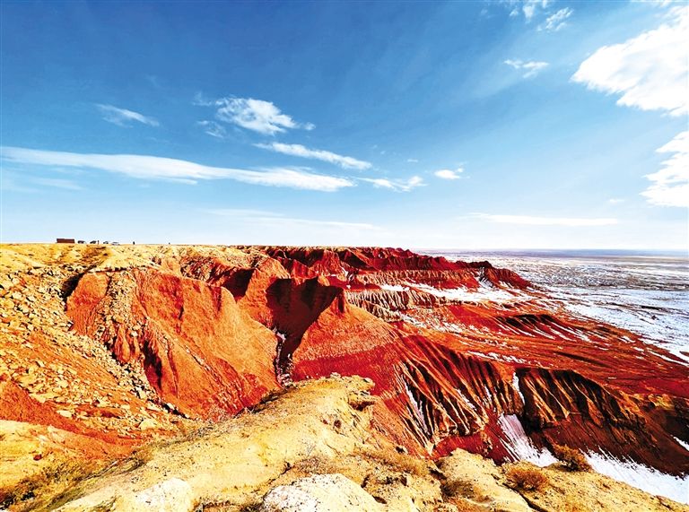 四子王旗大紅山,赤色丹霞地貌與雪原戈壁相映,繪就塞北獨有的蒼茫壯闊。王錦業(yè) 攝
