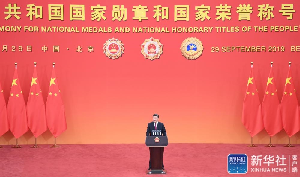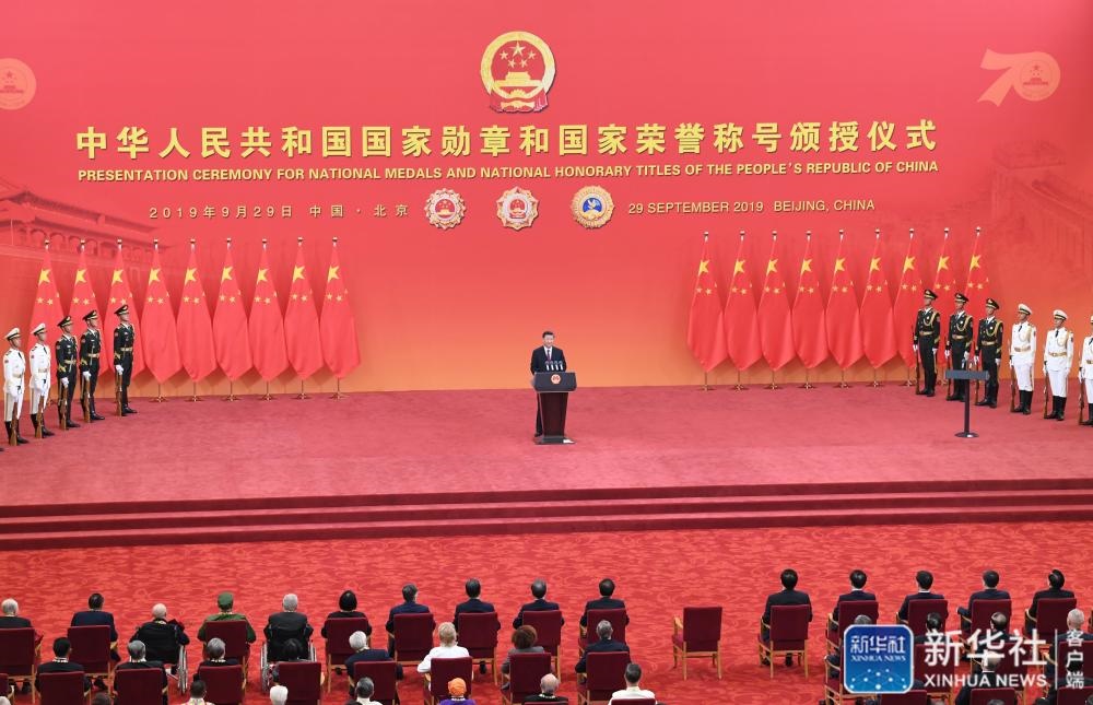 ↑9月29日,中華人民共和國(guó)國(guó)家勛章和國(guó)家榮譽(yù)稱號(hào)頒授儀式在北京人民大會(huì)堂金色大廳隆重舉行。中共中央總書(shū)記、國(guó)家主席、中央軍委主席習(xí)近平向國(guó)家勛章和國(guó)家榮譽(yù)稱號(hào)獲得者頒授勛章獎(jiǎng)?wù)虏l(fā)表重要講話。新華社記者黃敬文攝