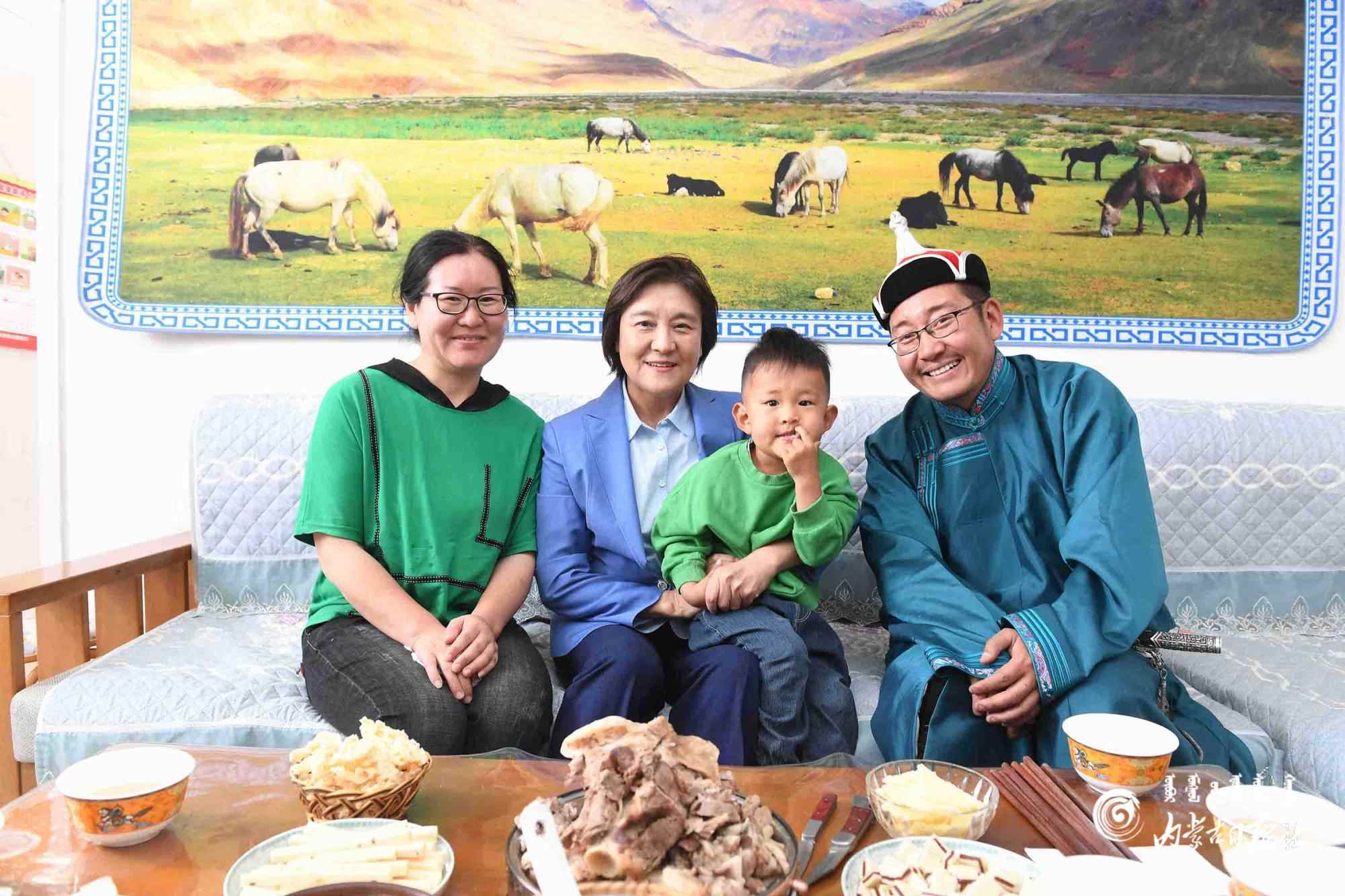 6月8日,自治區(qū)黨委副書記、自治區(qū)主席布小林在巴彥淖爾市烏拉特中旗調(diào)研,她來到希日朝魯嘎查牧戶呼斯勒家走訪,并與他們一家合影留念。內(nèi)蒙古日報(bào)社融媒體記者 韓卿立攝