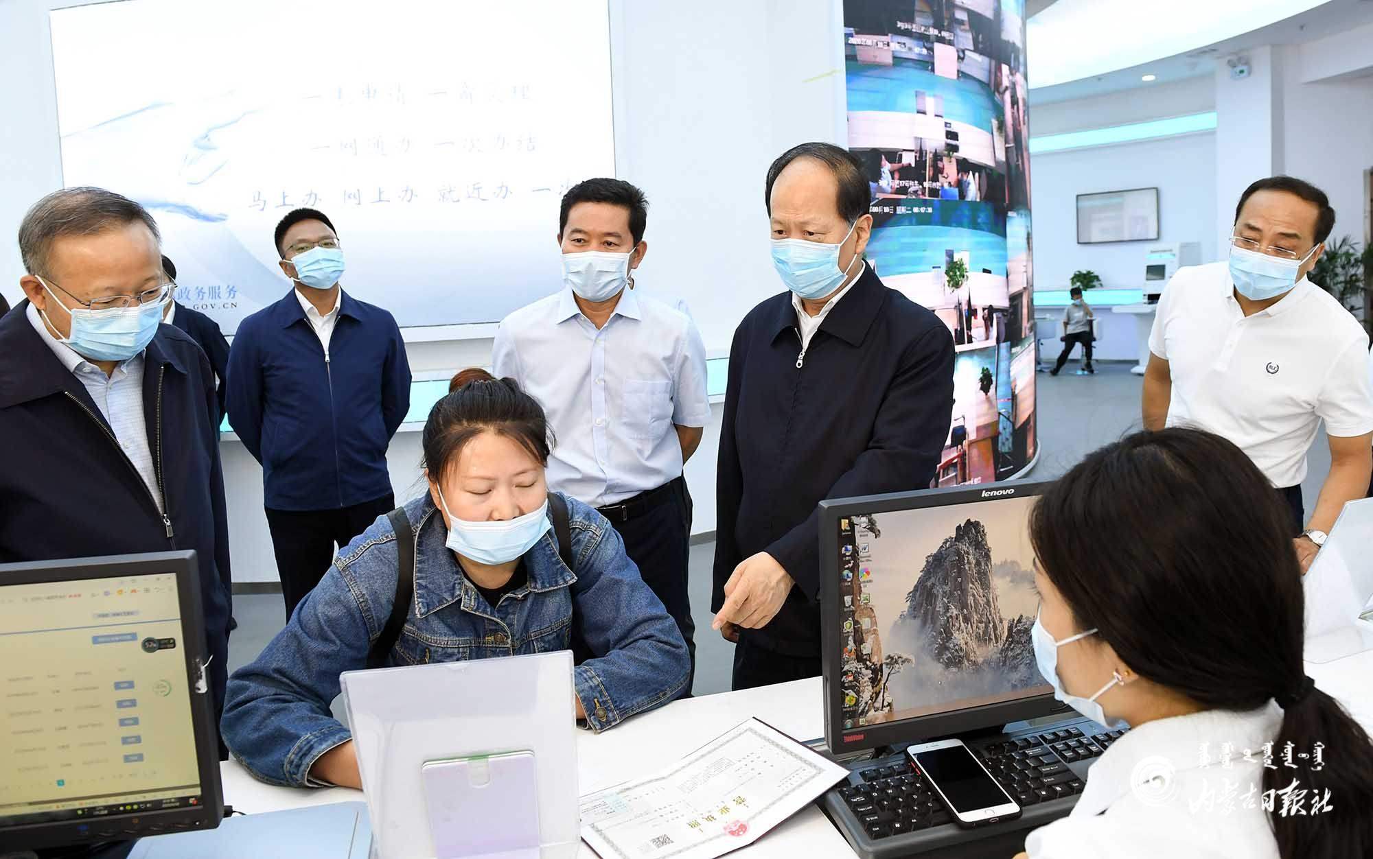 8月18日,自治區(qū)黨委書(shū)記、人大常委會(huì)主任石泰峰來(lái)到巴彥淖爾市臨河區(qū)市政服務(wù)中心,了解正在辦理企業(yè)注冊(cè)服務(wù)平臺(tái)流程。內(nèi)蒙古日?qǐng)?bào)記者 袁永紅 攝