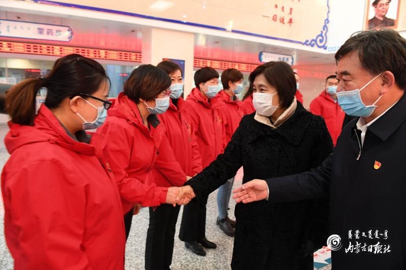 在烏蘭察布市蒙中醫(yī)院,布小林看望慰問了援鄂醫(yī)務(wù)工作者。醫(yī)院16名醫(yī)護(hù)人員是烏蘭察布市首批支援湖北的逆行者,2020年1月28日奔赴湖北,在荊門市第一人民醫(yī)院、鐘祥市同仁醫(yī)院等醫(yī)療機(jī)構(gòu)奮戰(zhàn)50多天。布小林與他們一一握手表達(dá)敬意和感謝。她動(dòng)情地說,你們?cè)谧钗<钡臅r(shí)刻挻身而出,義無反顧沖向抗疫一線,頑強(qiáng)拼搏,無私奉獻(xiàn),圓滿完成援鄂任務(wù),每一個(gè)人都非常了不起。目前的疫情防控形勢(shì)依然嚴(yán)峻復(fù)雜,希望大家繼續(xù)忠實(shí)履行醫(yī)務(wù)工作者的神圣職責(zé),同時(shí)要加強(qiáng)個(gè)人防護(hù)。她要求醫(yī)院精心做好內(nèi)部疫情防控工作,關(guān)心關(guān)愛醫(yī)護(hù)人員的身心健康。