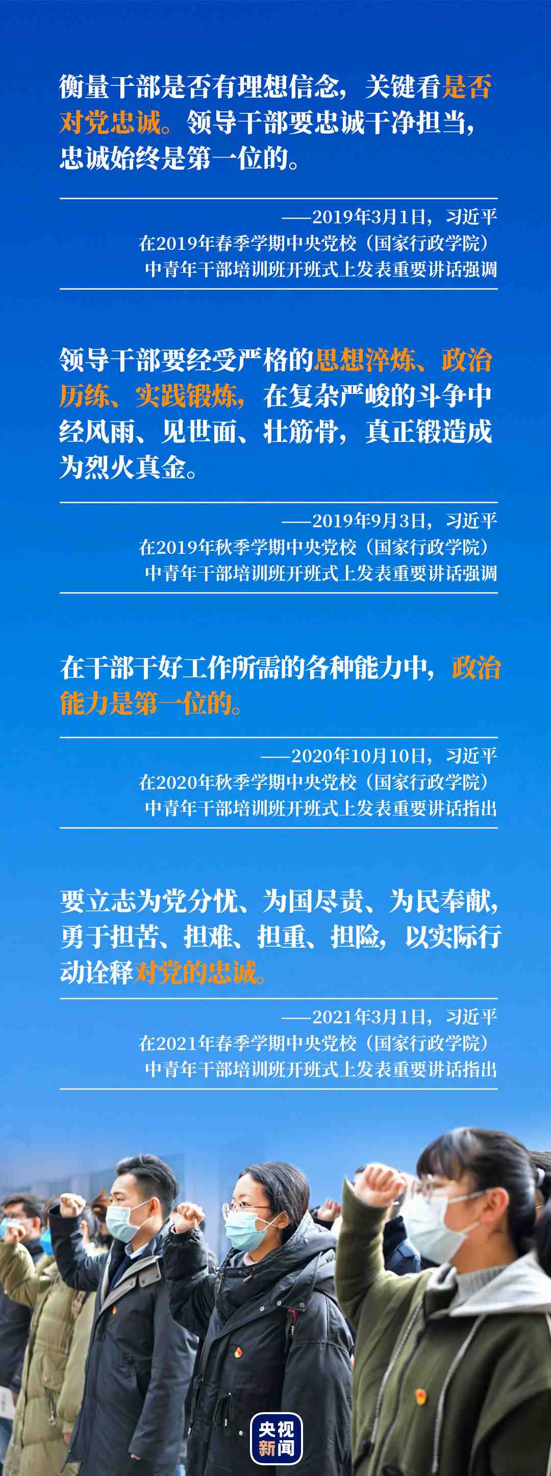 對黨忠誠、提高政治能力是總書記在近幾年中青年干部培訓(xùn)班開班式上授課的關(guān)鍵詞。