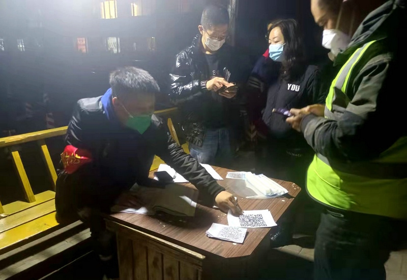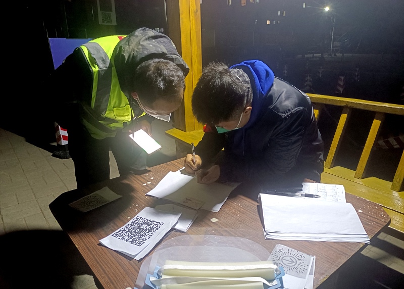 夜已深,志愿者仍堅(jiān)守在崗位上