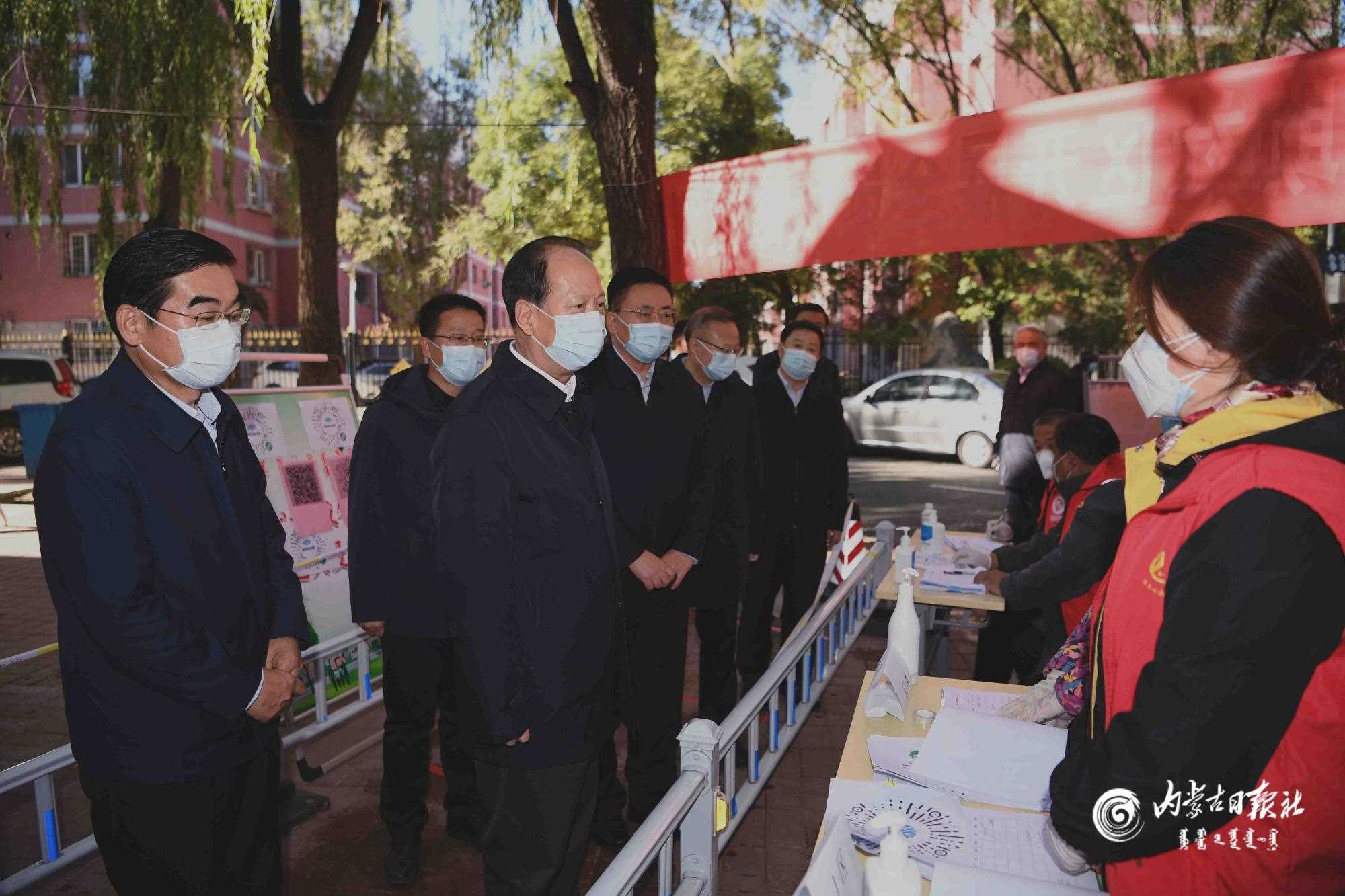10月26日,自治區(qū)黨委書記、人大常委會(huì)主任石泰峰在學(xué)府花園小區(qū),檢查入口健康碼查驗(yàn)、體溫檢測(cè)、值班值守等情況,并來(lái)到核酸檢測(cè)采樣點(diǎn),仔細(xì)察看采樣登記流程。內(nèi)蒙古日?qǐng)?bào)社融媒體記者 袁永紅 攝