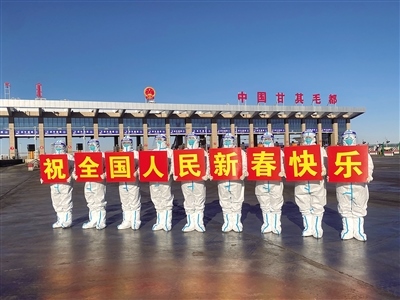 1月31日,民警在甘其毛都口岸貨運(yùn)通道祝全國人民新春快樂。春節(jié)期間,內(nèi)蒙古甘其毛都出入境邊防檢查站民警堅守一線,為出入境車輛提供優(yōu)質(zhì)高效的通關(guān)服務(wù),守護(hù)萬家燈火。(記者 孟和朝魯 通訊員 宋緒明 攝)