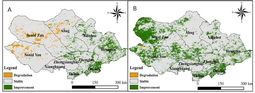 渾善達克沙地植被質量變化空間分異參考基線(A)與現狀(B) 。圖源:中國林科院荒漠化研究所
