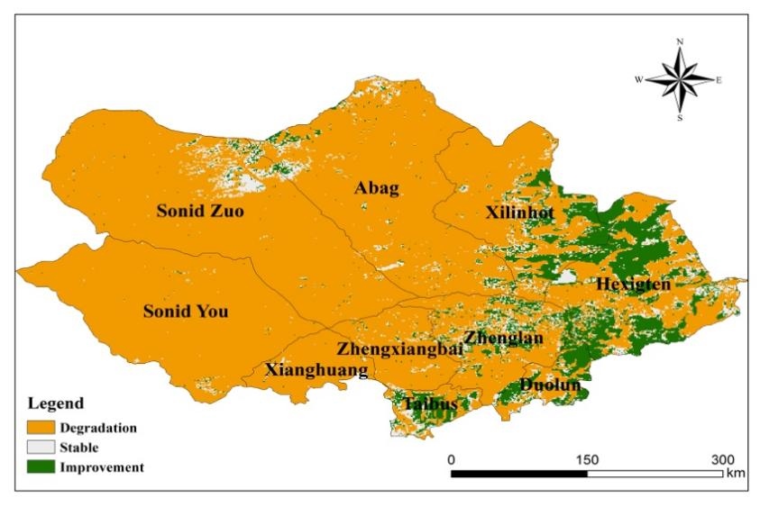 隨著國家生態(tài)恢復工程的啟動,渾善達克沙地未出現新的生態(tài)質量退化區(qū)域,目前生態(tài)系統(tǒng)質量提高區(qū)域占沙地五分之一,主要分布在東部。