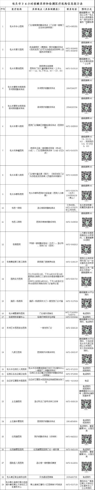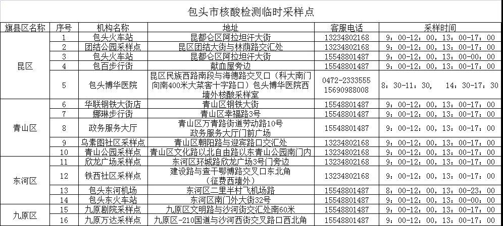 為方便廣大市民出行,做好“愿檢盡檢”人員的核酸檢測,提升核酸檢測效率,現(xiàn)公布包頭市29個24小時核酸采樣檢測機構(gòu)和16個臨時核酸采樣點,供廣大市民選擇。