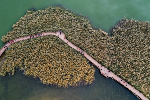 2021年10月17日,游客在居延海景區(qū)游玩(無(wú)人機(jī)照片)。新華社記者 劉磊 攝