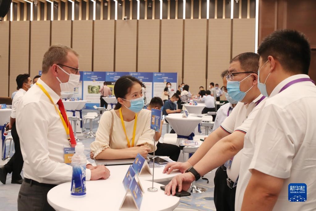 第五屆進(jìn)博會(huì)技術(shù)裝備展區(qū)展前供需對(duì)接會(huì)在上海舉行。這是參展商代表(前左二)在對(duì)接會(huì)上向采購(gòu)商介紹企業(yè)產(chǎn)品情況(2022年8月8日攝)。新華社記者 方喆 攝