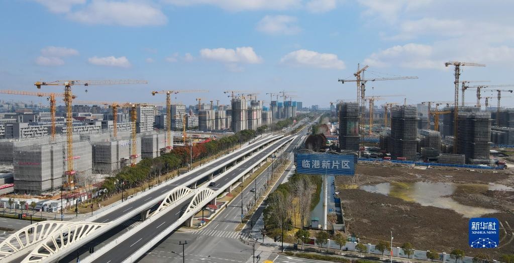 中國(guó)(上海)自由貿(mào)易試驗(yàn)區(qū)臨港新片區(qū)申港大道兩側(cè)塔吊林立(2022年2月10日攝,無(wú)人機(jī)照片)。新華社記者 方喆 攝