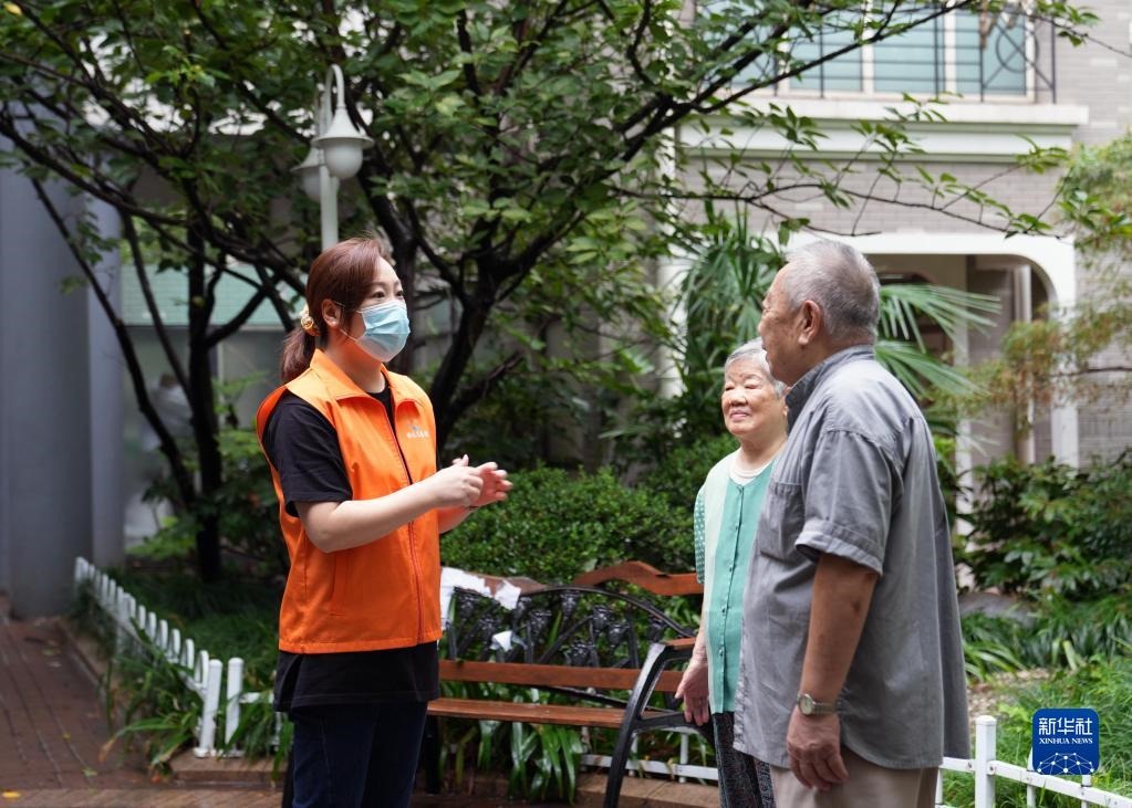 在上海靜安區(qū)石門二路街道新福康里,居民區(qū)黨總支書(shū)記魏瑛(左)在和居民交流(2022年9月15日攝)。新華社記者 劉穎 攝