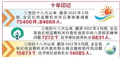 數(shù)據(jù)顯示,黨的十八大以來,截至2022年8月底,全區(qū)紀(jì)檢監(jiān)察機(jī)關(guān)立案審查調(diào)查75400件、84669人,做到有腐必反、除惡務(wù)盡,推動(dòng)政治生態(tài)持續(xù)向上向好。