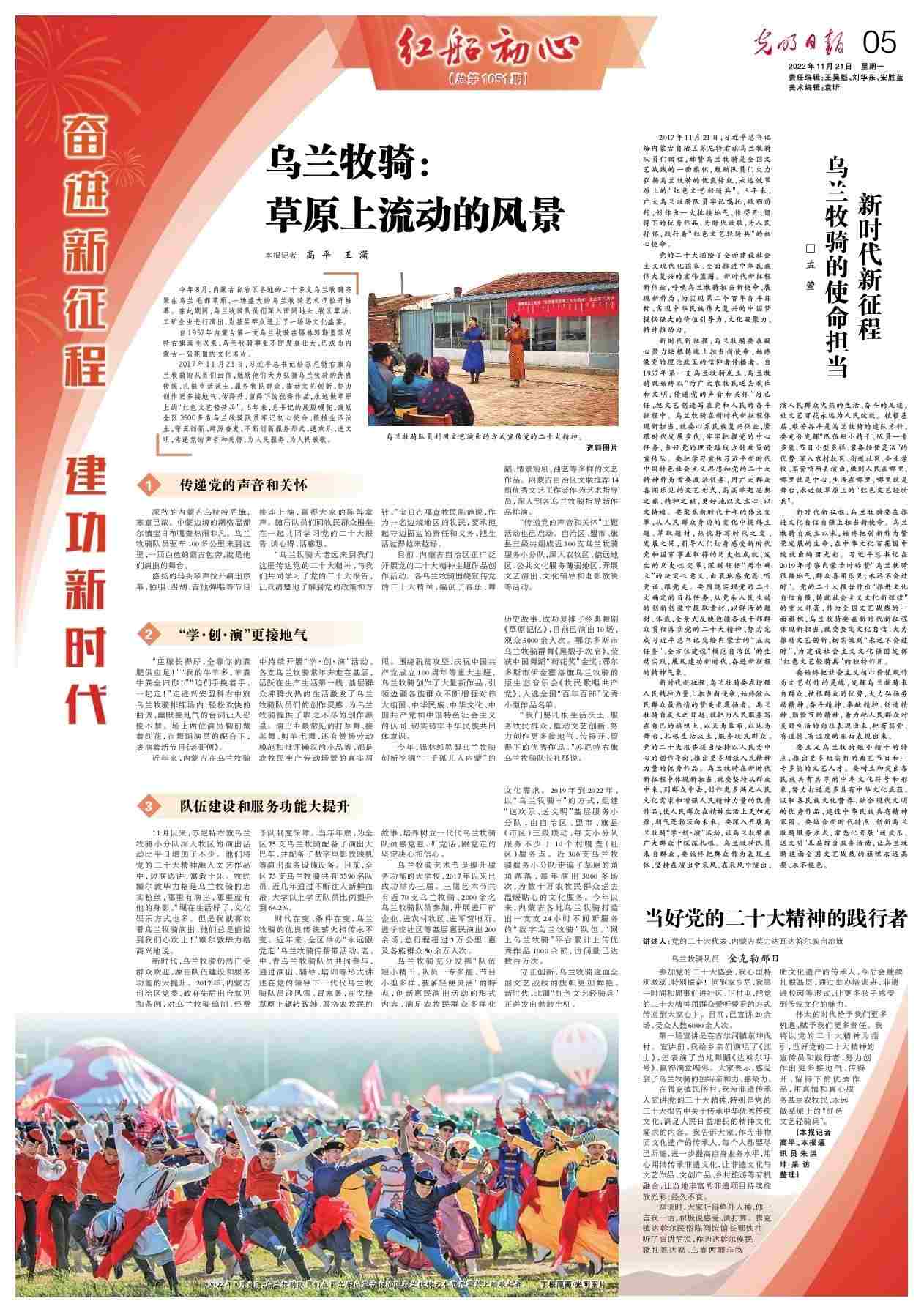 目前,內(nèi)蒙古自治區(qū)正廣泛開展黨的二十大精神主題作品創(chuàng)作活動。各烏蘭牧騎圍繞宣傳黨的二十大精神,編創(chuàng)了音樂、舞蹈、情景短劇、曲藝等多樣的文藝作品。內(nèi)蒙古自治區(qū)文聯(lián)推薦14組優(yōu)秀文藝工作者作為藝術指導員,深入到各烏蘭牧騎指導新作品排演。