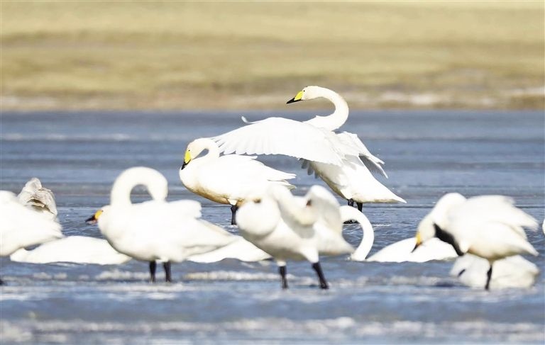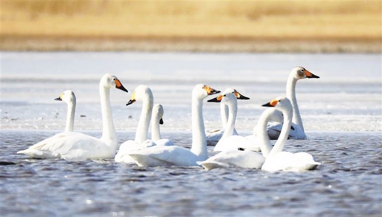 晶晶忍不住感嘆:“我和盈盈每次南飛或北遷,都要在沉湖‘打卡’,這個城市濕地已變成了小天鵝的‘會客廳’。前些年,這里可不好玩,用人類的話說,它‘曾經滿目瘡痍,如今萬鳥翔集、水草豐美’。”