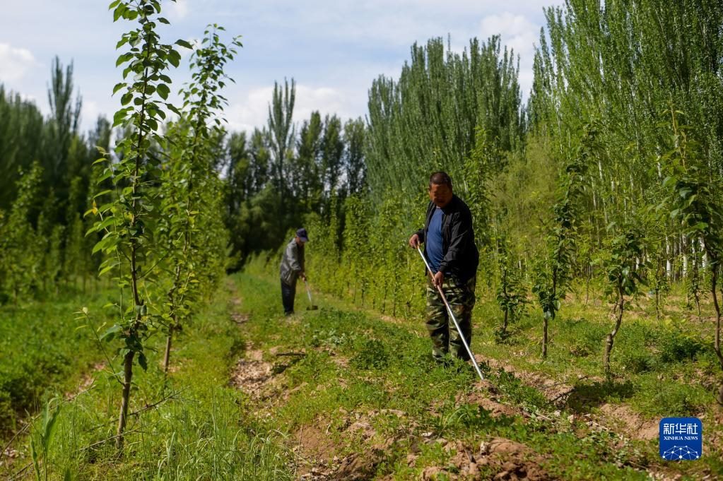 6月5日,臨河區(qū)國(guó)營(yíng)新華林場(chǎng)工人在管護(hù)林木。新華社記者 李志鵬 攝