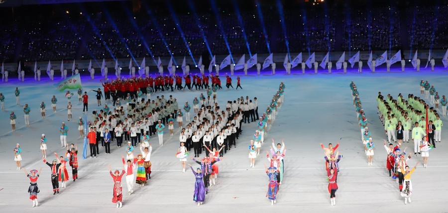 入場儀式結(jié)束后,在雄壯的國歌聲中,鮮艷的五星紅旗冉冉升起,在體育中心上空迎風(fēng)飄揚(yáng)。期盼的眼神,真摯的祝福,蕩漾在每個(gè)人的心間。開幕式文體展演隨后正式拉開帷幕。