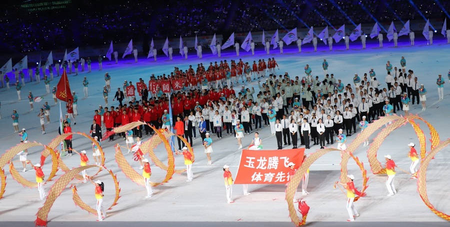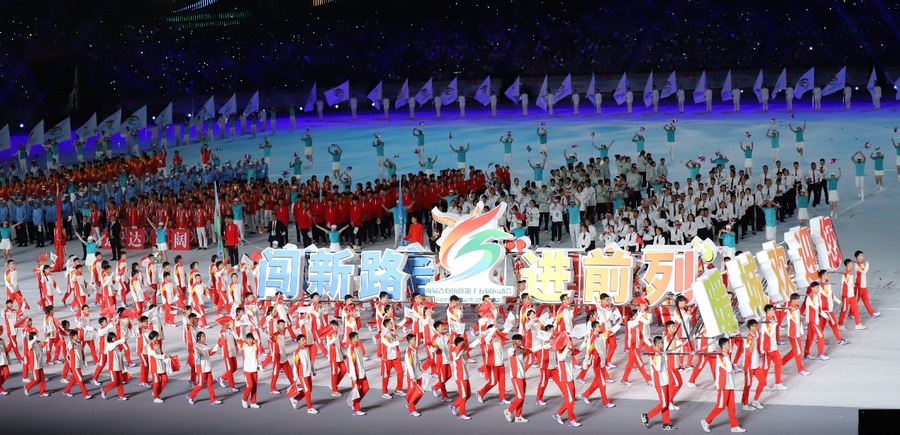 開幕式現(xiàn)場座無虛席,萬眾矚目下儀仗隊(duì)護(hù)送五星紅旗步入會(huì)場,國旗莊嚴(yán),腳步鏗鏘,一種豪邁和驕傲激蕩在每個(gè)人的心里。