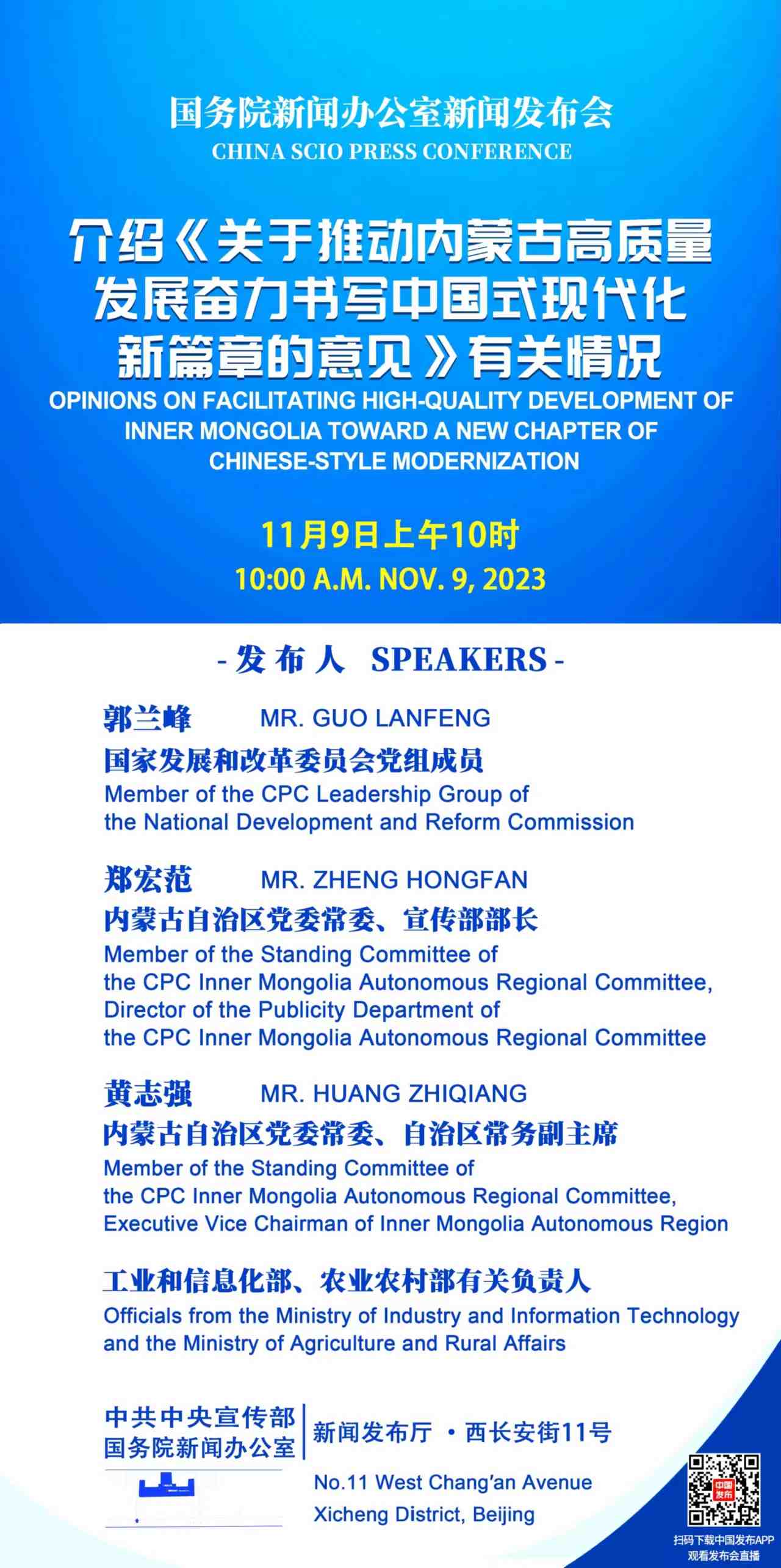 2023年11月9日(星期四)上午10時,國務院新聞辦公室舉行新聞發(fā)布會,請國家發(fā)展和改革委員會黨組成員郭蘭峰,內(nèi)蒙古自治區(qū)黨委常委、宣傳部部長鄭宏范,內(nèi)蒙古自治區(qū)黨委常委、自治區(qū)常務副主席黃志強和工業(yè)和信息化部、農(nóng)業(yè)農(nóng)村部有關負責人介紹《關于推動內(nèi)蒙古高質(zhì)量發(fā)展奮力書寫中國式現(xiàn)代化新篇章的意見》有關情況,并答記者問。