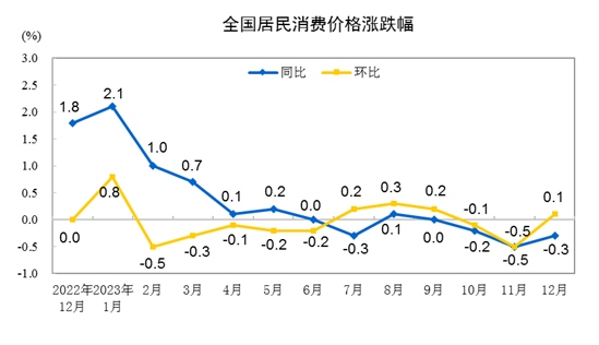 2023年12月份,全國居民消費(fèi)價格同比下降0.3%。其中,城市下降0.3%,農(nóng)村下降0.5%;食品價格下降3.7%,非食品價格上漲0.5%;消費(fèi)品價格下降1.1%,服務(wù)價格上漲1.0%。