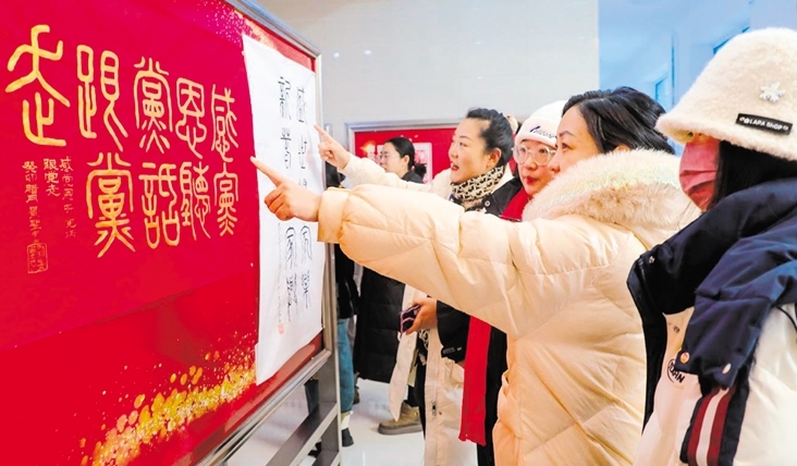 各類參展作品掛在以紅色為底的展板上,新年的氛圍感瞬間拉滿。“舉辦這次活動(dòng)特別有意義,真的很喜歡這種文化氛圍?!眱?nèi)蒙古自治區(qū)第八屆道德模范獲得者鄭洪山邊看邊說(shuō)。