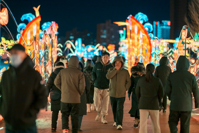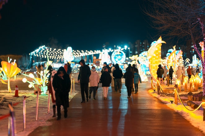 當(dāng)晚,呼和浩特零下15攝氏度左右,寒冷擋不住市民欣賞流光溢彩的燈會(huì),只見市民穿著保暖的外套,戴著帽子手套,一邊逛燈會(huì),一邊拍照片、拍視頻,還有的市民開直播,與全國各地的網(wǎng)友一起分享這美好時(shí)刻。