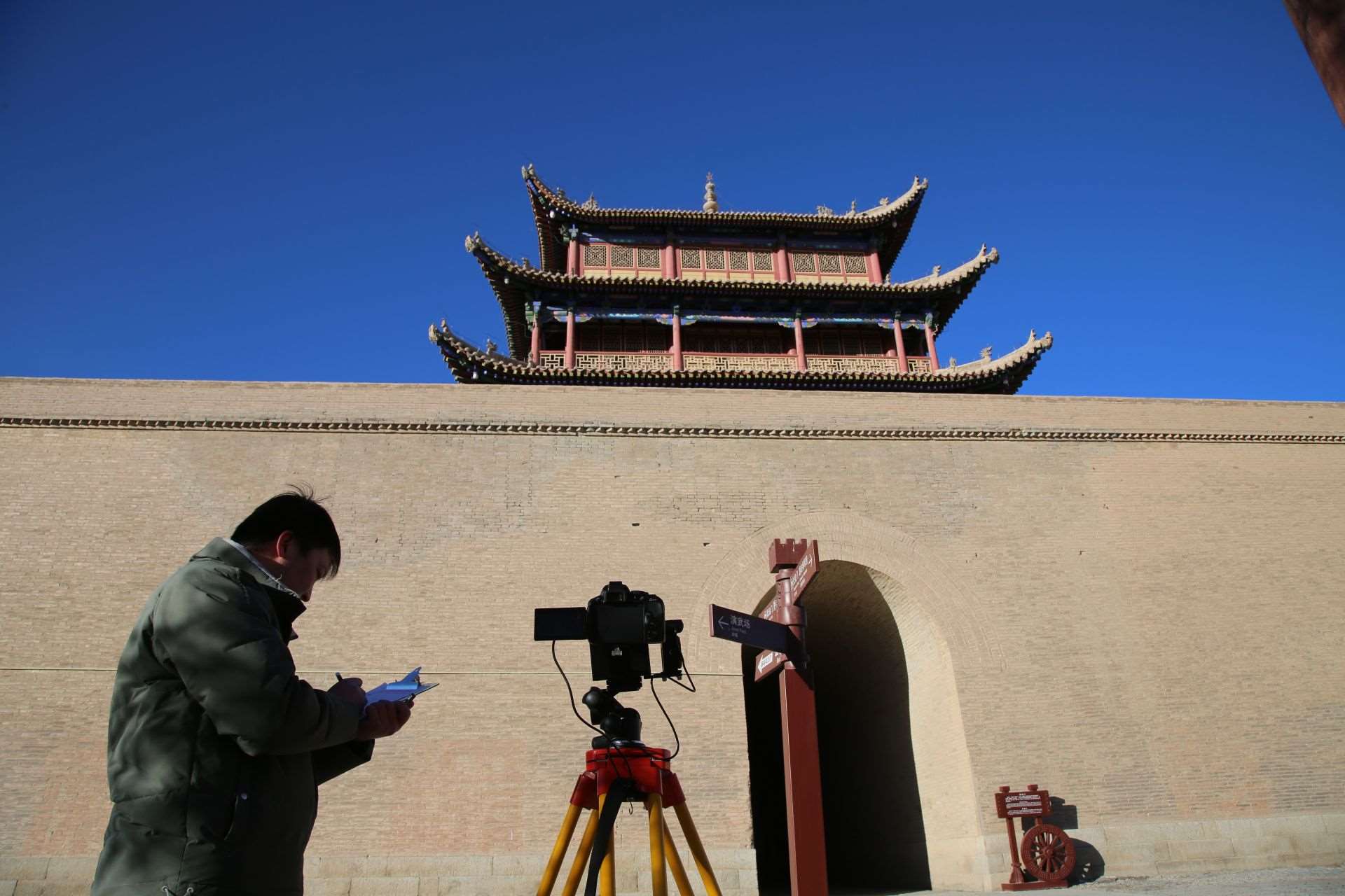 1月29日,嘉峪關(guān)絲路(長城)文化研究院文化遺產(chǎn)監(jiān)測中心工作人員高商,正在對柔遠(yuǎn)樓城臺裂縫進(jìn)行定期監(jiān)測。戈壁上的風(fēng)很“硬氣”,高商寫字的手有點(diǎn)不聽使喚:“當(dāng)長城醫(yī)生可不能偷懶,‘定期查體’都要做得仔仔細(xì)細(xì),這樣才能及時‘防病治病’?!蓖略谏砗笄那陌聪驴扉T,高商渾然不覺。