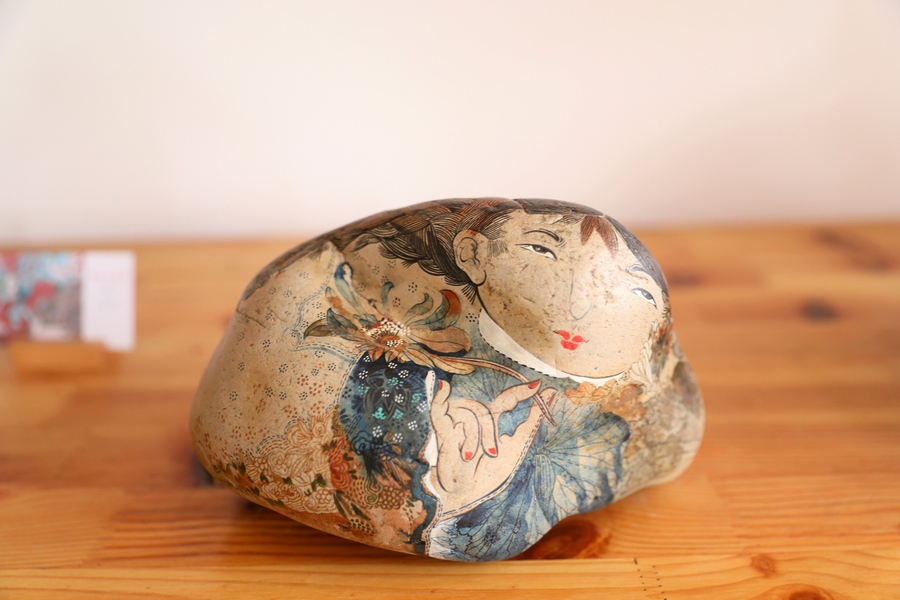 魯婷介紹她創(chuàng)作的石畫(huà)作品