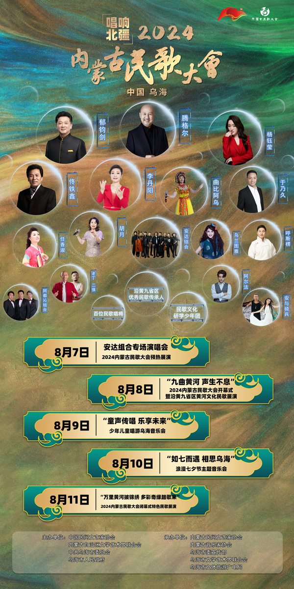 2024內(nèi)蒙古民歌大會的主舞臺坐落在烏海湖畔,為期5天的民歌之旅,分別以“2024內(nèi)蒙古民歌大會預熱展演——安達組合專場音樂會”“九曲黃河 聲生不息——2024內(nèi)蒙古民歌大會開幕式暨沿黃九省區(qū)黃河文化民歌展演”“童聲傳唱 樂享未來——少年兒童唱游烏海音樂會”“如七而遇 相思烏?!寺呦?jié)主題音樂會”“萬里黃河披錦繡 多彩奇緣踏歌來——2024內(nèi)蒙古民歌大會閉幕式特色民歌展演”為主題,節(jié)目形式兼顧地域屬性和民歌種類,涵蓋原生民歌、經(jīng)典民歌、創(chuàng)編民歌,充分展示各民族、各地域特色民歌的獨特魅力。