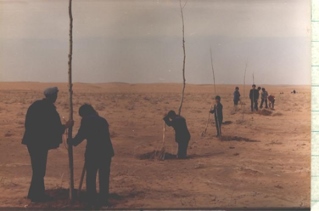 ??“領導都帶頭干,王占文書記包的我們奮勇大隊,帶我們種沙柳。全大隊11個生產隊,排著隊、唱著歌,把紅旗插在各自的沙梁上。民兵也領著娃娃們來種樹,他們掏坑,娃娃遞樹栽子。幾年下來,把奮勇大隊種成了自治區(qū)最早的萬畝林大隊。馮耀華當時是公社副書記,包的是阿魯柴登,郭巨才當時是公社副主任,包了什里加汗。王占文還專門組織了測繪隊,繪出地圖,統(tǒng)一規(guī)劃,給所有農田種上防護林,定下在哪修路種上行道樹。20年后按圖修路時,施工隊發(fā)現,路基兩旁的樹早種好了。”白三寶回憶。