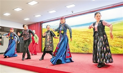 11月12日,烏蘭牧騎隊(duì)員在北京市西城區(qū)德勝街道辦事處與群眾一同跳舞。當(dāng)日,內(nèi)蒙古自治區(qū)直屬烏蘭牧騎攜包頭市達(dá)茂旗烏蘭牧騎、鄂爾多斯市伊金霍洛旗烏蘭牧騎開展“紅色文藝輕騎兵 烏蘭牧騎在北京”——北疆文化神州行文藝演出活動(dòng)。據(jù)了解,此次烏蘭牧騎進(jìn)京演出活動(dòng),從11月6日至17日,在北京的民族文化宮為觀眾奉獻(xiàn)33場(chǎng)精彩的演出,同時(shí)還將走進(jìn)社區(qū)和學(xué)校開展多場(chǎng)演出活動(dòng)。 (記者 王磊 攝)