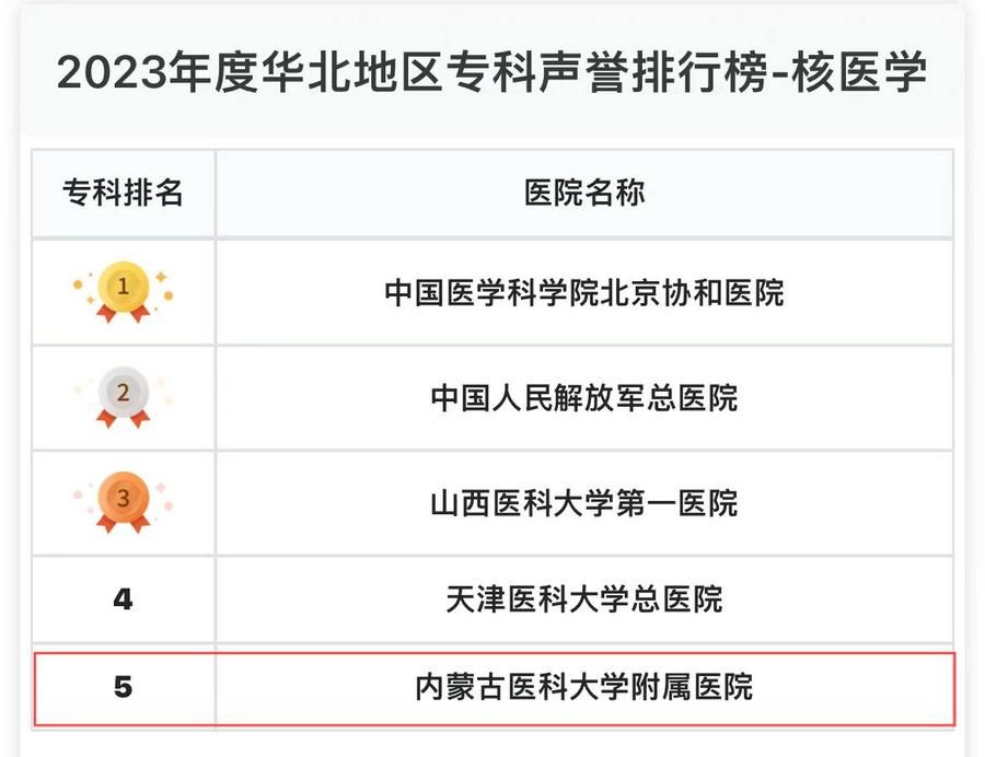 內(nèi)蒙古醫(yī)科大學(xué)附屬醫(yī)院核醫(yī)學(xué)科位列華北區(qū)第五,神經(jīng)外科、婦產(chǎn)科、風(fēng)濕科、重癥醫(yī)學(xué)、眼科、消化科、生殖醫(yī)學(xué)、腎臟病、皮膚科、內(nèi)分泌科、麻醉科、老年醫(yī)學(xué)、口腔科、檢驗(yàn)醫(yī)學(xué)、急診醫(yī)學(xué)、變態(tài)反應(yīng)、疼痛學(xué)、罕見病、耳鼻喉科、健康管理、血液科、整形外科等22個(gè)??偏@提名,是內(nèi)蒙古自治區(qū)在此榜單獲前五和提名專科最多的醫(yī)院。