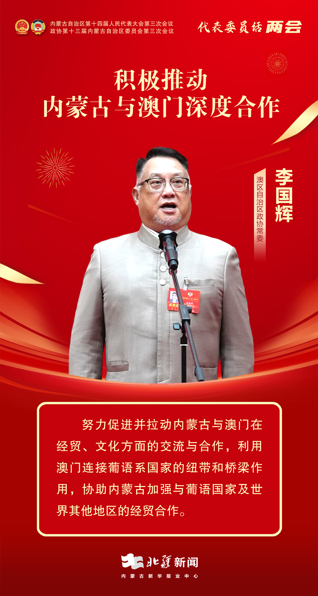 “我尤為關(guān)注內(nèi)蒙古經(jīng)濟(jì)社會(huì)的發(fā)展變化,透過(guò)一些發(fā)展數(shù)據(jù)和親身調(diào)研考察,我感受到內(nèi)蒙古各項(xiàng)事業(yè)蓬勃發(fā)展的火熱勢(shì)頭?!崩顕?guó)輝如是介紹。