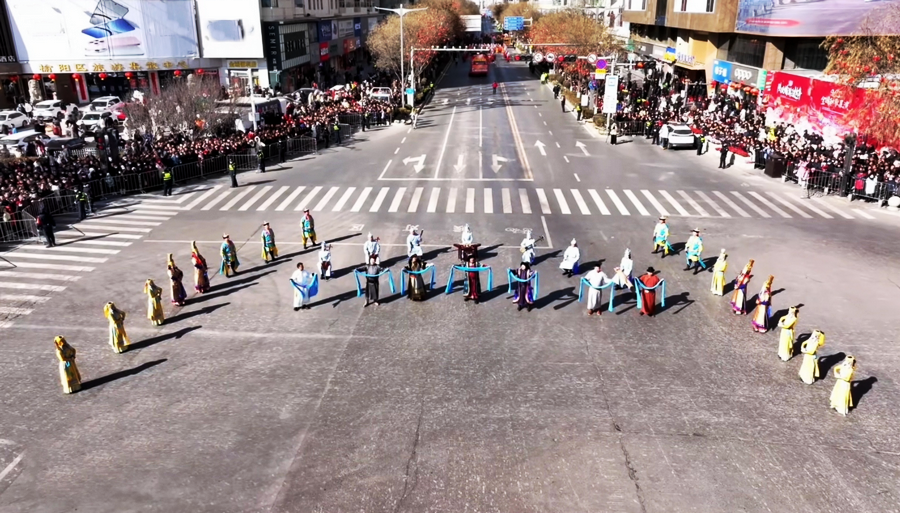 演出當(dāng)天,杭錦旗烏蘭牧騎的演員們,和來自全國各省的秧歌隊成員們,一起在榆林古城大街進行展演,為觀眾帶來了古如歌歌舞樂《草原的祝福》、鄂爾多斯民歌《家鄉(xiāng)美》、《尖嘴子沙梁》等表演,以情景歌舞的表演形式,表達北疆草原兒女濃濃的情誼與祝福。