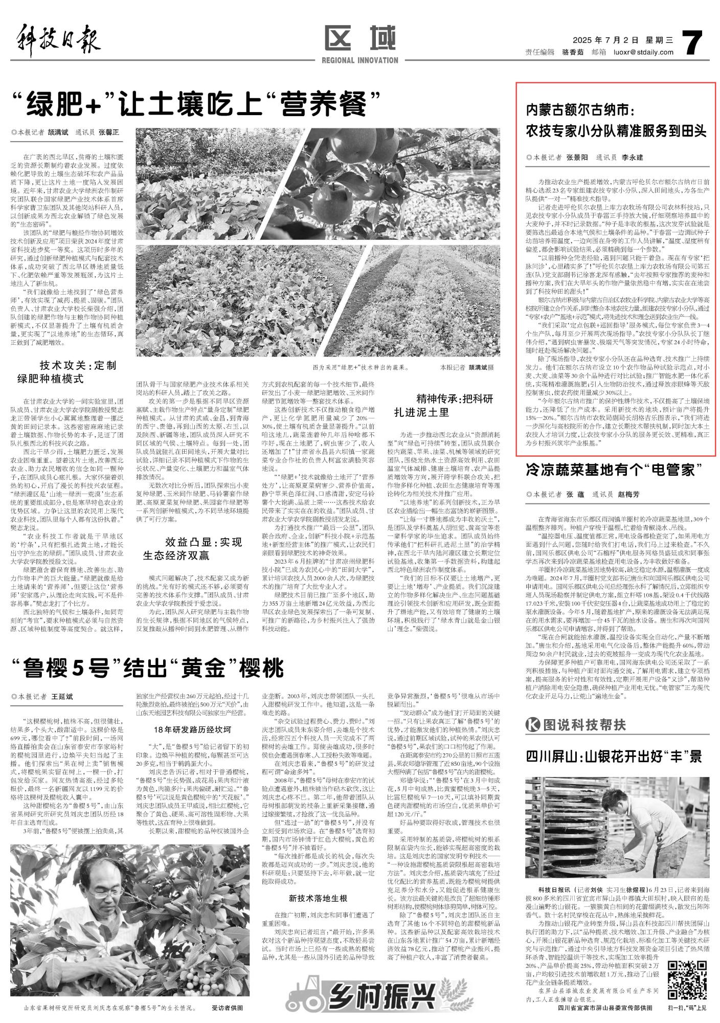 2025年7月2日《科技日?qǐng)?bào)》第7版刊發(fā)了《內(nèi)蒙古額爾古納市:農(nóng)技專家小分隊(duì)精準(zhǔn)服務(wù)到田頭》的文章,報(bào)道了內(nèi)蒙古呼倫貝爾市額爾古納市積極與內(nèi)蒙古自治區(qū)農(nóng)牧業(yè)科學(xué)院、內(nèi)蒙古農(nóng)業(yè)大學(xué)等高校院所建立合作關(guān)系,同時(shí)整合本地農(nóng)技力量,組建農(nóng)技專家小分隊(duì),通過“專家+農(nóng)戶”“基地+示范”模式,將先進(jìn)技術(shù)和理念送到農(nóng)業(yè)生產(chǎn)一線。