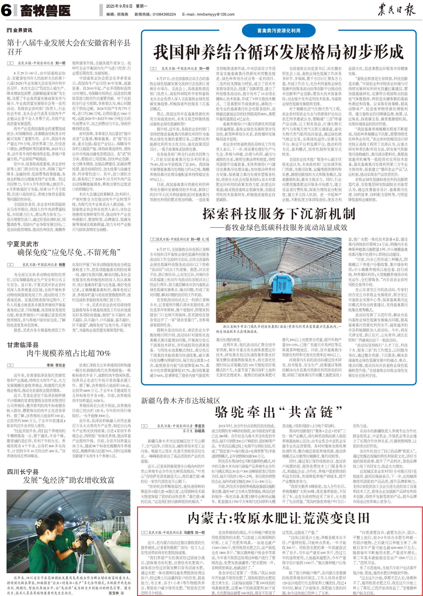 2025年9月8日,《農(nóng)民日報》第6版整版刊發(fā)題為《內(nèi)蒙古:牧原水肥讓荒漠變良田》的文章,報道了在內(nèi)蒙古奈曼旗的牧原養(yǎng)殖場環(huán)保區(qū),工作人員用水肥對120畝沙地進(jìn)行生態(tài)修復(fù)和土壤改良,經(jīng)過4年時間,解決了沙地保水、保肥能力差的問題,如今這塊地已經(jīng)種上了玉米。