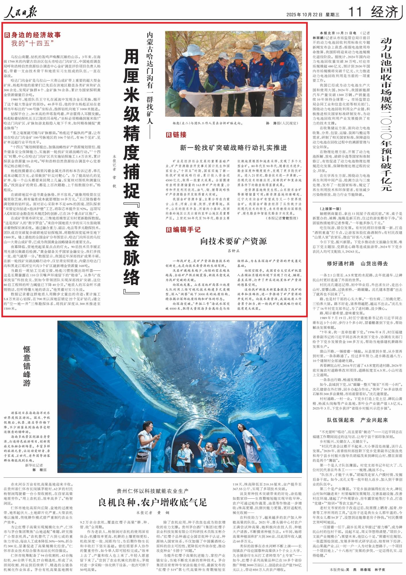 2025年10月22日,《人民日?qǐng)?bào)》第11版刊發(fā)題為《內(nèi)蒙古哈達(dá)門溝有一群找礦人——用厘米級(jí)精度捕捉“黃金脈絡(luò)”》的文章,報(bào)道了中國(guó)地質(zhì)調(diào)查局楊彪團(tuán)隊(duì)在內(nèi)蒙古哈達(dá)門溝礦區(qū)奮戰(zhàn)3年,依托前輩基礎(chǔ),累計(jì)探明黃金百余噸,“十四五”期間新增10余噸,鉆孔見礦率超行業(yè)平均。