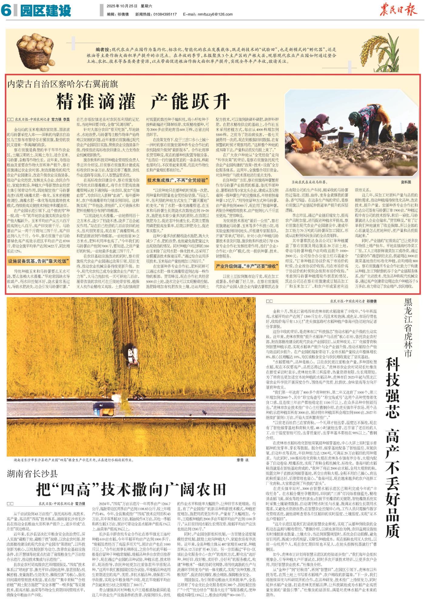 2025年10月25日,《農(nóng)民日報》第6版刊發(fā)題為《內(nèi)蒙古自治區(qū)察哈爾右翼前旗:精準(zhǔn)滴灌 產(chǎn)能躍升》的文章,報道了內(nèi)蒙古烏蘭察布市察哈爾右翼前旗通過現(xiàn)代農(nóng)業(yè)產(chǎn)業(yè)園推廣滴灌水肥一體化等技術(shù),推動玉米、馬鈴薯單產(chǎn)大幅提升,成功實現(xiàn)從“靠天吃飯”到科技增收的轉(zhuǎn)變。