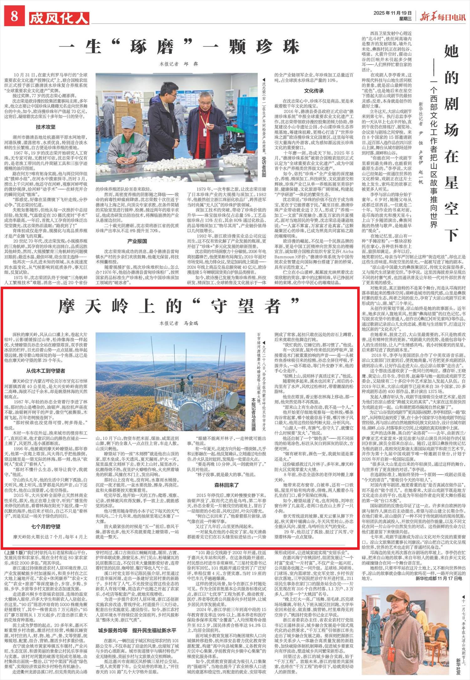 2025年11月19日,《新華每日電訊》第8版刊發(fā)題為《摩天嶺上的“守望者”》的文章,報道了摩天嶺位于內(nèi)蒙古呼倫貝爾市牙克石市綽河源鎮(zhèn)西南40公里處,是大興安嶺嶺南的第二高峰。火情瞭望員孫忠全站在瞭望塔頂,雙手扶著冰涼的欄桿,目光沿著山勢一點點延展。他舉起望遠(yuǎn)鏡,搜尋著山坳深處的每一個角落。這已是他在摩天嶺守望的第29個年頭。