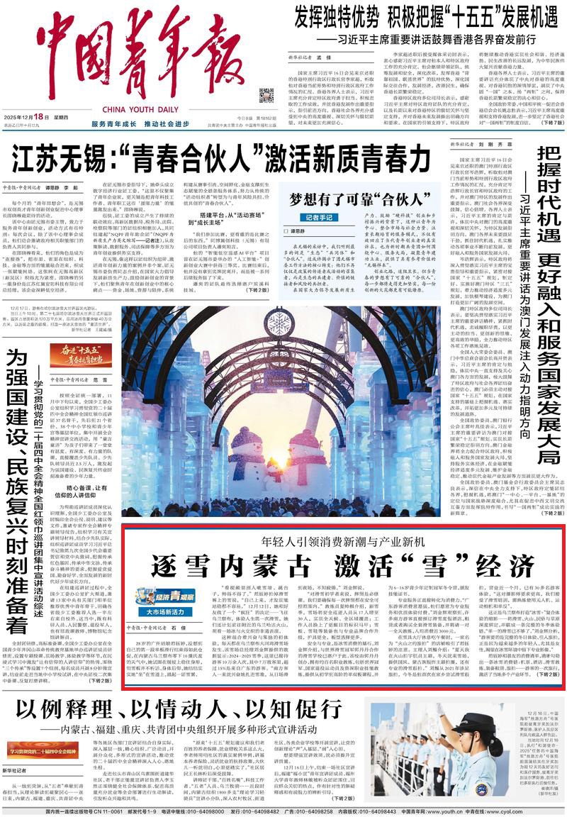 2025年12月18日《中國青年報(bào)》第1版刊發(fā)了《大市場(chǎng)新活力 年輕人引領(lǐng)消費(fèi)新潮與產(chǎn)業(yè)新機(jī) 逐雪內(nèi)蒙古 激活“雪”經(jīng)濟(jì)》的文章,報(bào)道了烏蘭察布大河灣滑雪場(chǎng)是打造“冰雪+”復(fù)合體驗(yàn)的縮影——將滑雪、火山、民俗與草原深度綁定,串聯(lián)成一條完整的冬季體驗(yàn)鏈。
