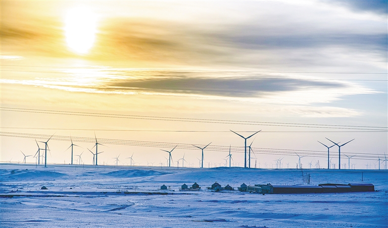 湛藍(lán)天幕之下,150座白色風(fēng)車(chē)如鋼鐵巨人般巍然矗立,巨大的風(fēng)機(jī)葉片迎風(fēng)轉(zhuǎn)動(dòng),劃破長(zhǎng)風(fēng),發(fā)出低沉而均勻的呼嘯,與天地間的遼闊寂靜共鳴。