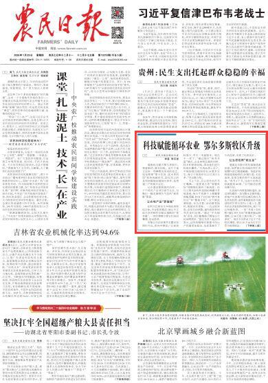 2026年1月29日,《農(nóng)民日報》頭版刊發(fā)題為《科技賦能循環(huán)農(nóng)業(yè) 鄂爾多斯牧區(qū)升級》的文章,報道了在內(nèi)蒙古鄂爾多斯市祖祖輩輩“靠天吃飯、逐水草而居”的傳統(tǒng)被改寫,取而代之的是科技賦能的精細(xì)化種養(yǎng),是貫通三產(chǎn)的新興業(yè)態(tài)。越來越多的農(nóng)牧民,正沿著“新一產(chǎn)”鋪就的這條路,走向收入更穩(wěn)、底氣更足的好日子?! ?/p>