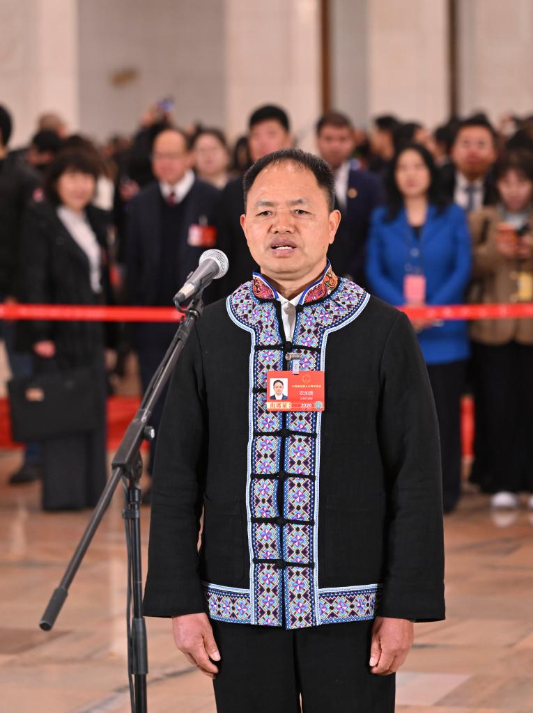 3月5日,第十四屆全國(guó)人民代表大會(huì)第四次會(huì)議首場(chǎng)“代表通道”集中采訪活動(dòng)在北京人民大會(huì)堂舉行。這是全國(guó)人大代表農(nóng)加貴接受媒體采訪。