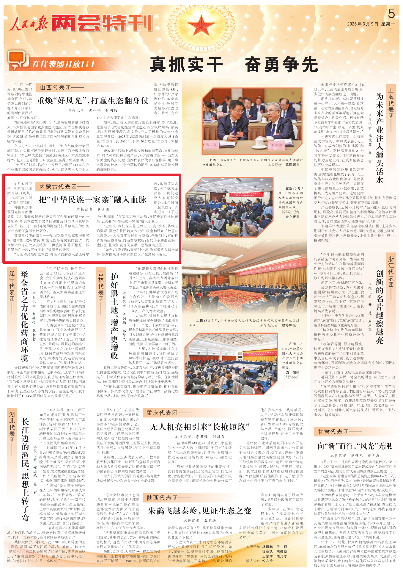 2026年3月9日,《人民日?qǐng)?bào)》第5版刊發(fā)題為《內(nèi)蒙古代表團(tuán)——把“中華民族一家親”融入血脈》一文,報(bào)道了3月6日下午,內(nèi)蒙古代表團(tuán)開放日現(xiàn)場(chǎng),“中華民族共同體”成為高頻詞。