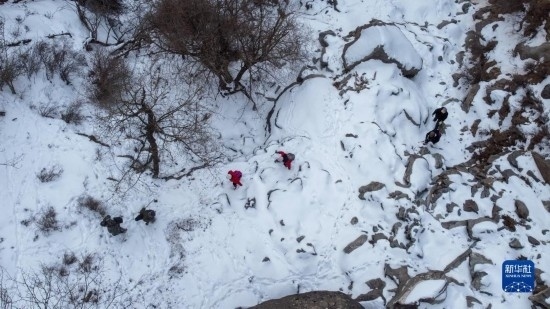 2月20日,在內(nèi)蒙古賀蘭山國家級自然保護(hù)區(qū),工作人員在山間跋涉(無人機(jī)照片)。