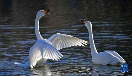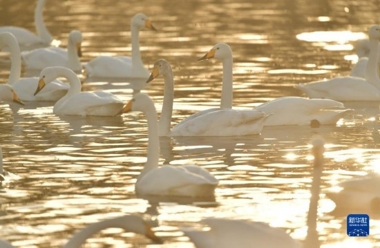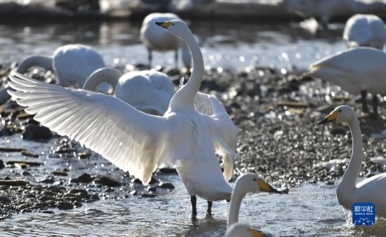 入冬以來,遼寧省北票市八家子鄉(xiāng)紅村大凌河畔的400多只白天鵝在河水淺灘處嬉戲覓食,吸引人們前來觀賞和拍照。