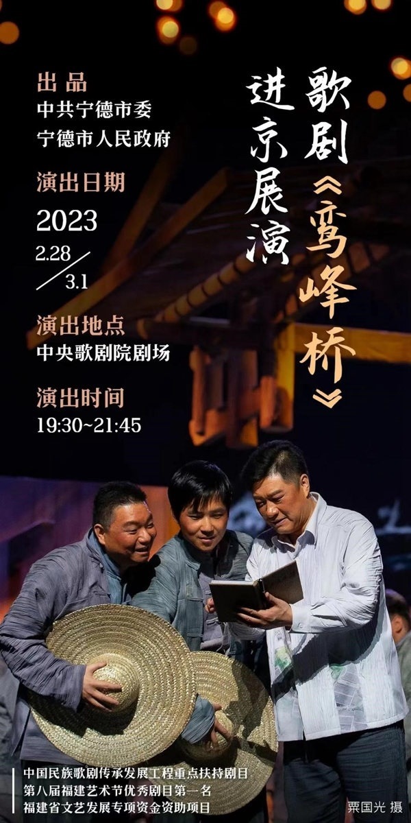 人民網(wǎng)福州2月27日電 (劉卿)日前,文化和旅游部公布“新時代舞臺藝術(shù)優(yōu)秀劇目展演”進(jìn)京集中示范演出劇目,由中共寧德市委、寧德市人民政府出品的歌劇《鸞峰橋》入選。據(jù)了解,該劇將于2月28日至3月1日每晚19:30至21:45在中央歌劇院劇場進(jìn)行展演。
