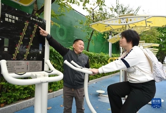 4月24日,西河智慧體育公園工作人員(左)向晨練的市民介紹具備對運動數(shù)據(jù)進行采集、分析等多項功能的智能競賽健身車。