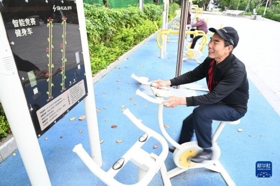4月24日,市民在福州市鼓樓區(qū)西河智慧體育公園使用智能競賽健身車。